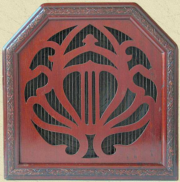 Dit exemplaar heeft een massief mahoniehouten kast, met een bewerkt houten sierrand. Achter het gezaagde front zijn een aantal vertikale draden gespannen. De kast is niet erg diep, slechts 16 cm en laat zich gemakkelijk opstellen.