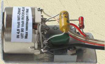 Bij gebruik van een wat grotere potkern (30 mm doorsnede) vermindert de ruststroom met een faktor vier bij een gelijkblijvend rendement. De transformator is met de hand gewikkeld, dit is niet erg kritisch. Wikkelverhouding is 1:15. De 67,5 Volt wordt afgenomen via 2 drukknopen, deze zijn afkomstig uit de naaidoos van mijn vrouw. Het aan-uit schakelaartje is tussen de drukknopen gemonteerd, dit is niet in alle gevallen de beste plek, maar komt goed uit bij de genoemde Champion ontvanger. De behuizing is gemaakt van stevig karton en beplakt met een papieren kopie van een originele B101 batterijbehuizing. Bij gebruik van de batterij in de genoemde Champion radio is geen enkele storing hoorbaar die afkomstig zou kunnen zijn van de batterij.